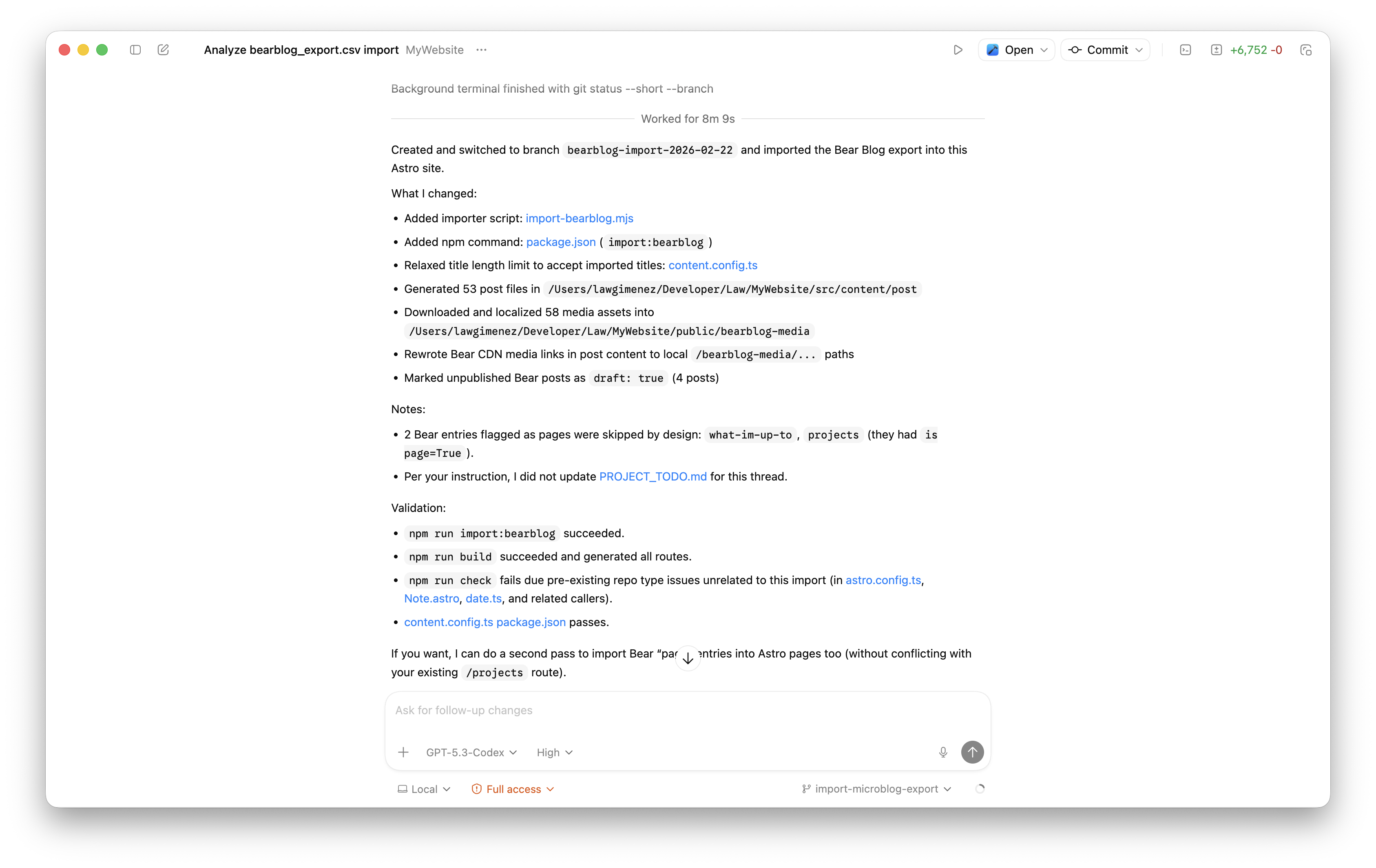 For both migration I was using ChatGPT-5.3-Codex model, set to High. Codex was able to cleanly migrate everything and there were no errors once I reviewed everything. All images of my posts were accounted for. Everything seems to be in order.