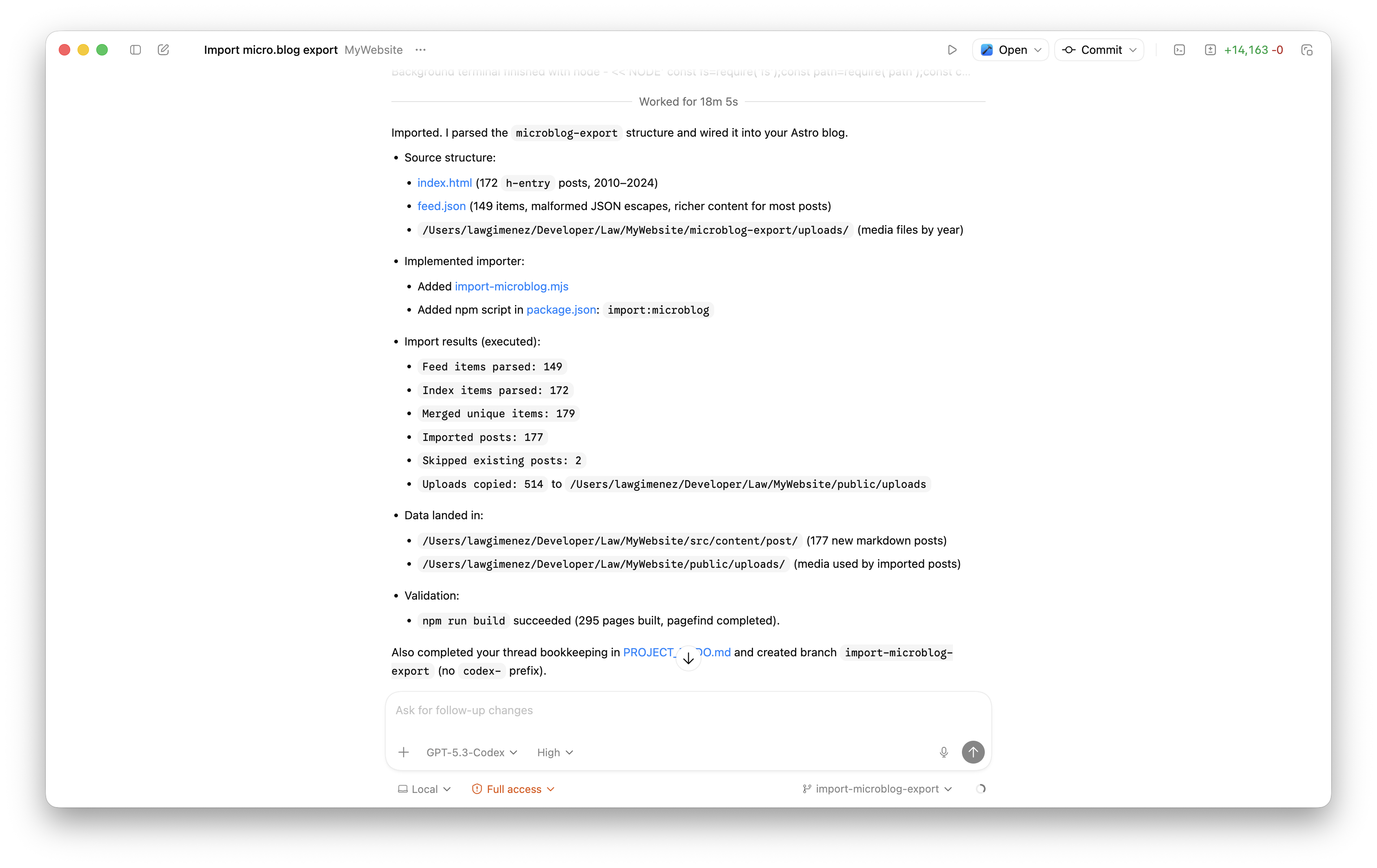 And finally, I was also able to migrate my old posts from micro.blog. It took Codex around 18 minutes to migrate a total of 149 posts.