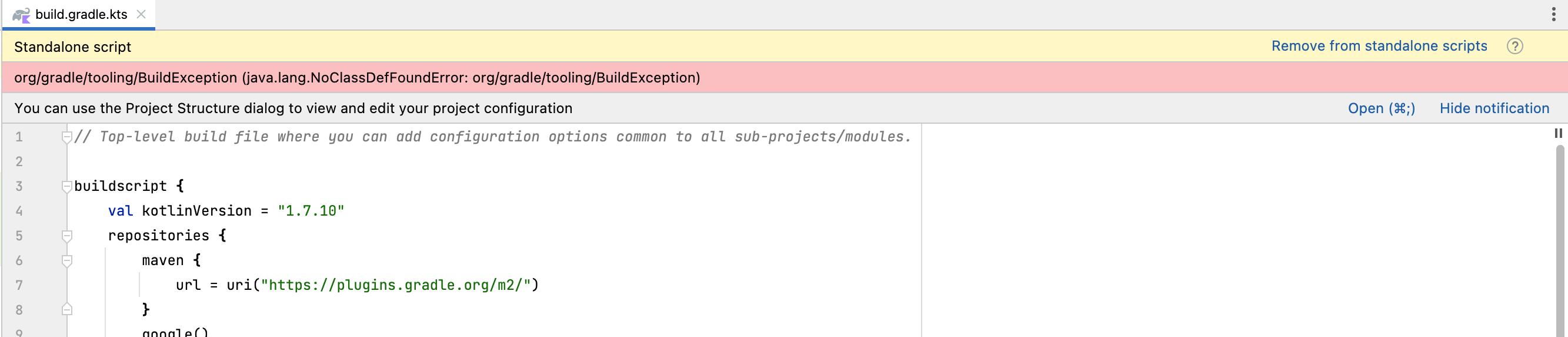 It seems that the error went away after declining the “standalone script” option in Android Studio.