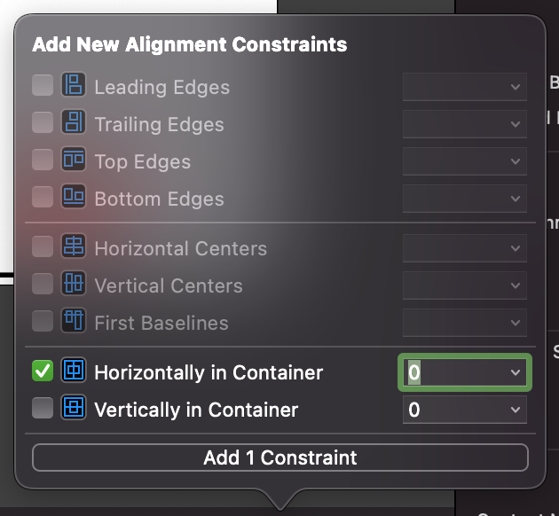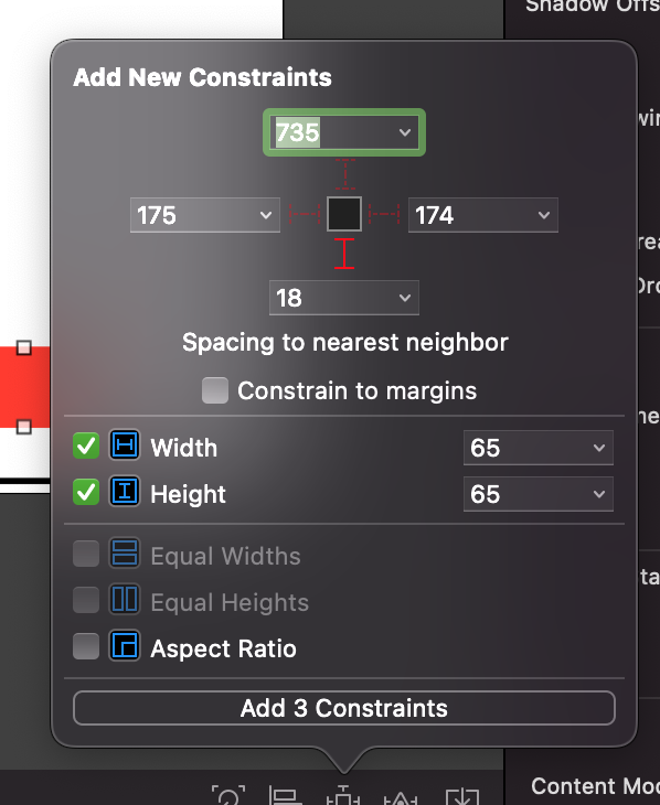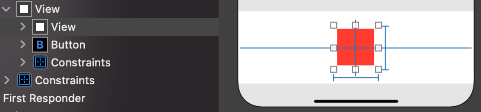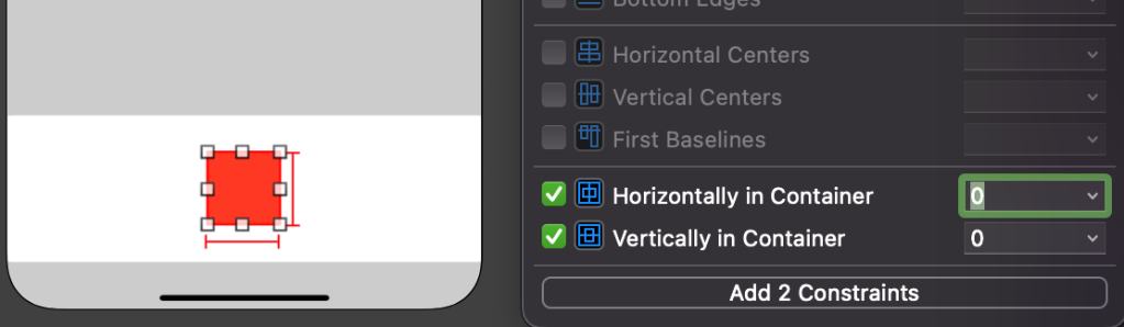 Now, for the border that will surround our UIButton. Drag a UIView inside the container UIView and behind the UIButton and make sure it is much more larger in terms of width and height. Set both width and height to 80. For our border UIView, add the following width and height constraints and also the horizontally and vertically constraint, same with our UIButton. It should look like the one below.
