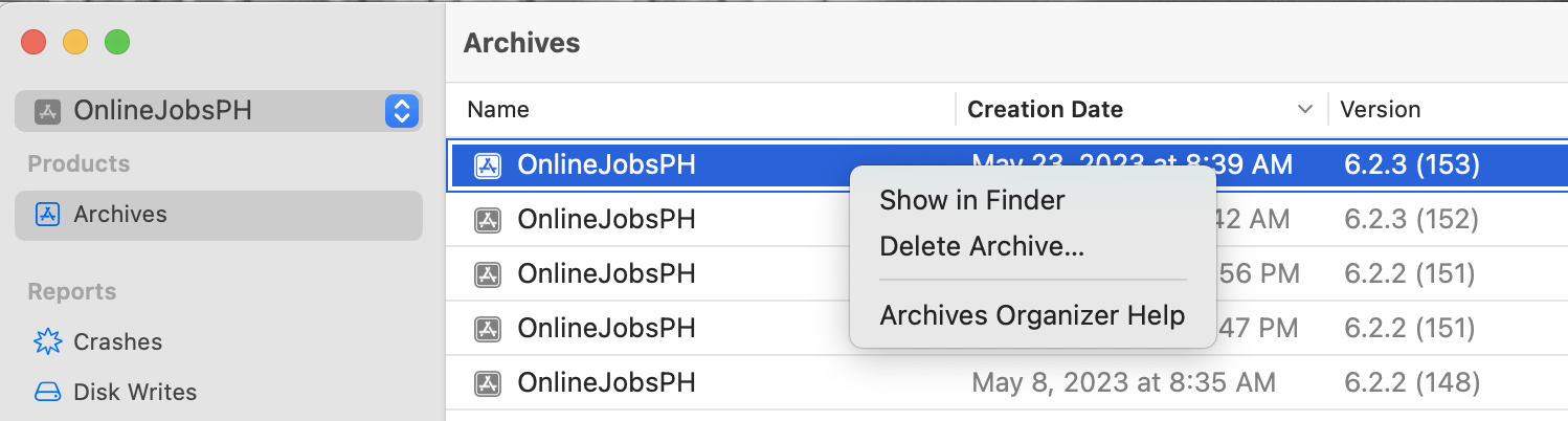 Open the Window organizer in your Xcode and go to the Archive option and right-click on a particular build. Then, select Show in Finder option.
