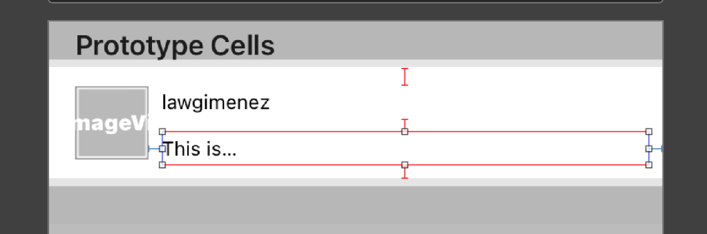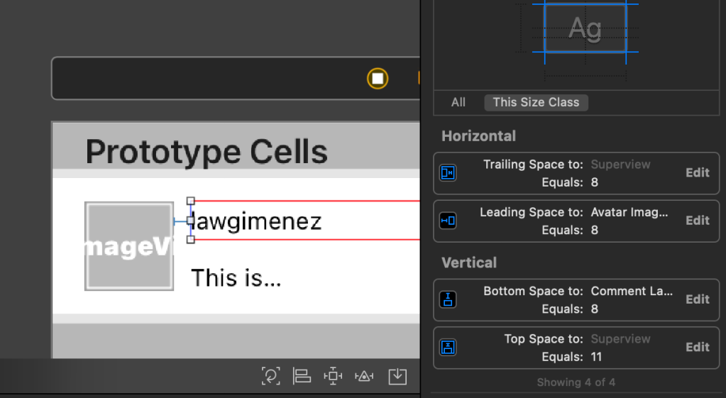Next, the constraints for the username UILabel. As you may notice I did not specified a Height constraint, thus the red error for both UILabels.