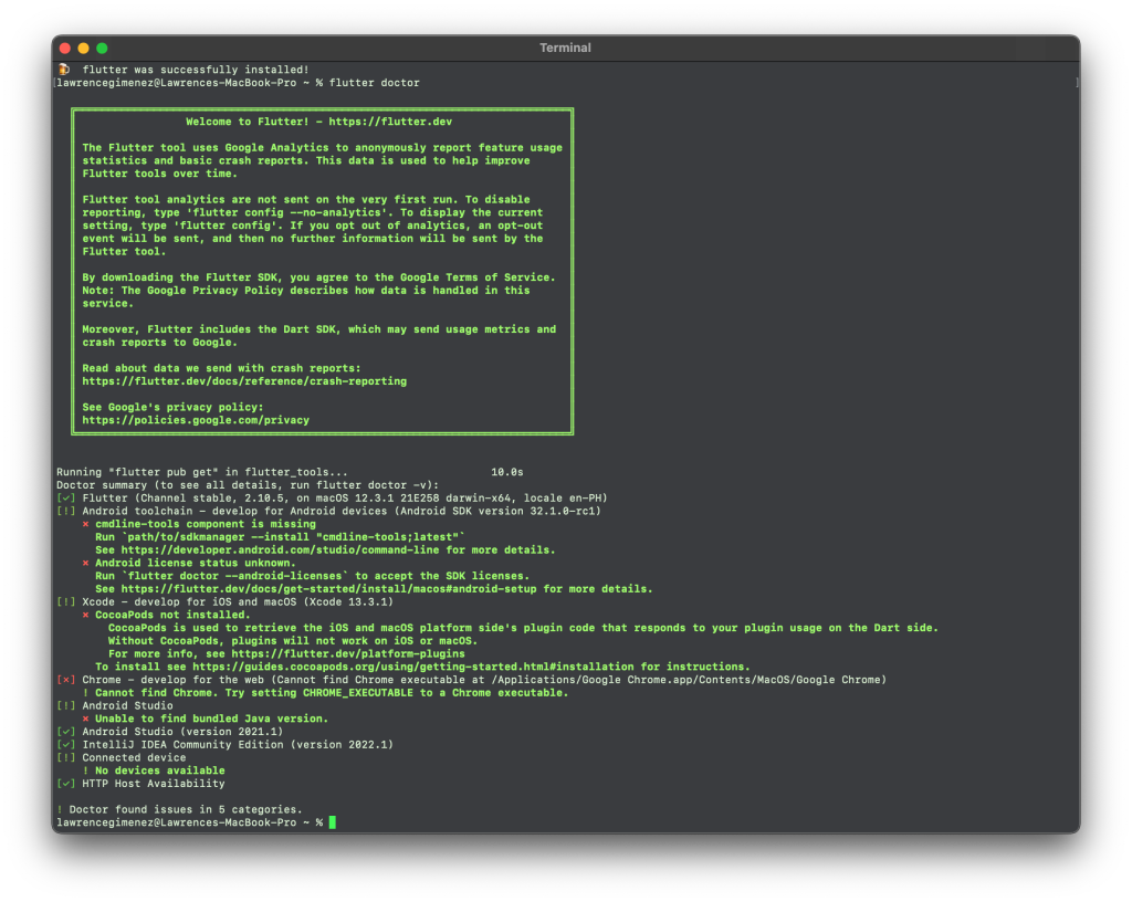 A couple of things that caught my attention. Cocoapods not installed, okay makes sense. And “cannot find Chrome”? Yes, I don’t use Chrome.