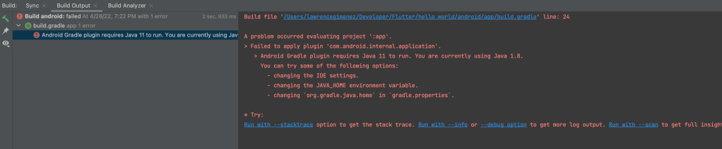 And the build failed. It seems Flutter does not yet support AGP 7.1.3 or Java 11. It’s a shame since our current Android project (Kotlin) has been built with AGP 7.1.3 as long as I can remember.