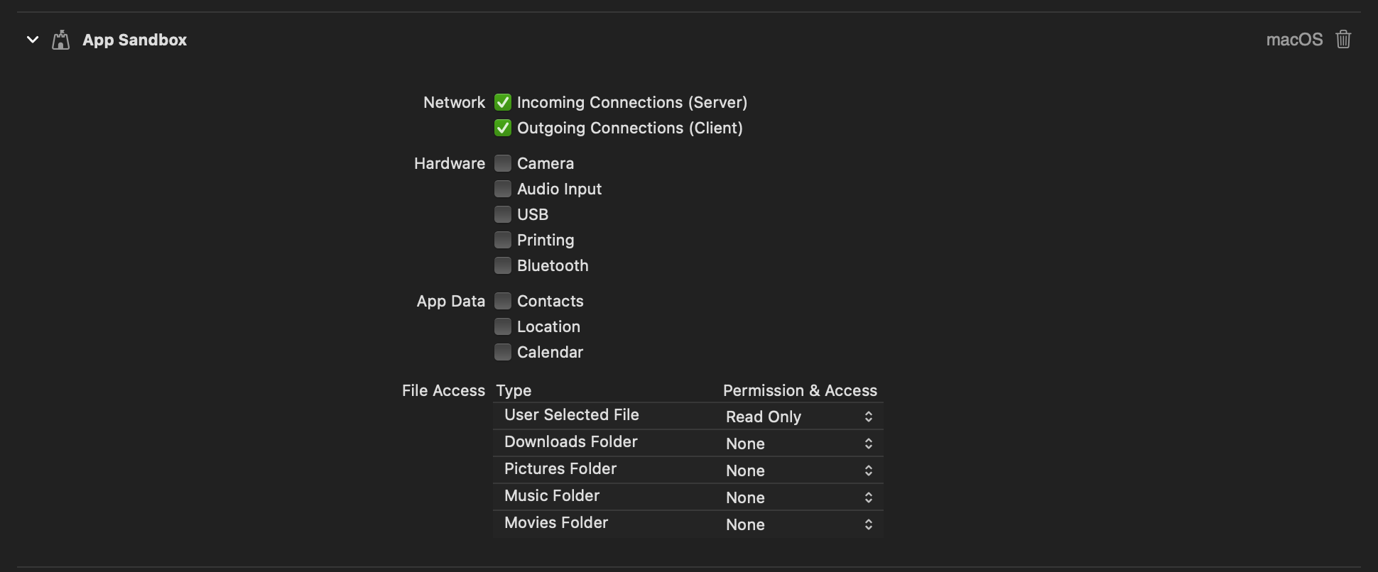 Do not forget to enable network capabilities in Xcode’s App Sandbox menu.