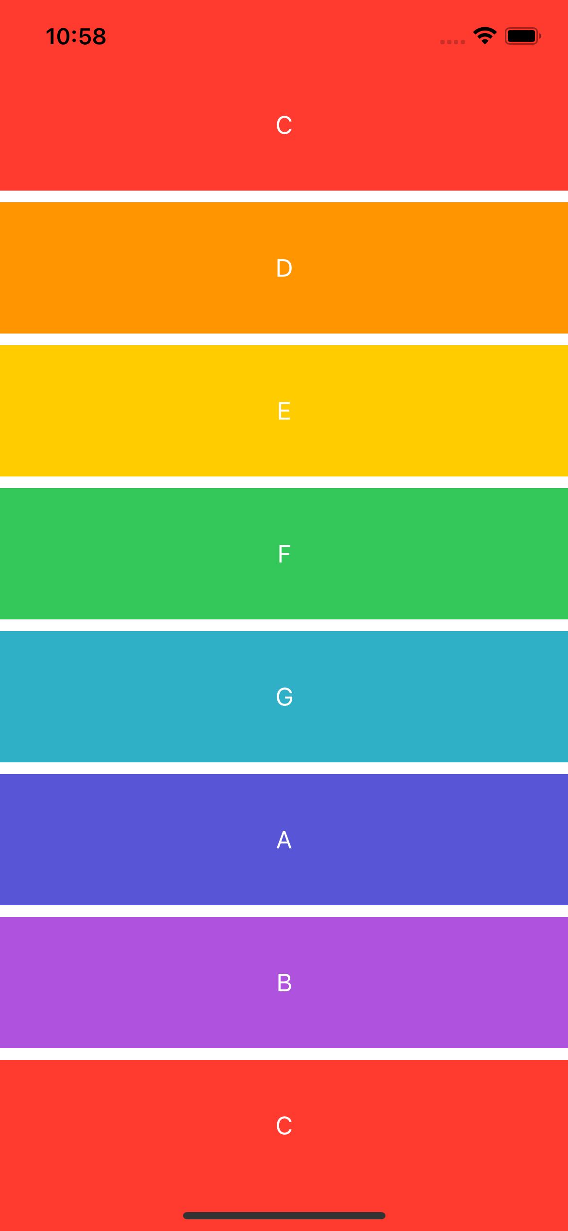 var body: some View { VStack { Button(action: { play(sound: "C") }) { Text("C") .foregroundColor(.white) .frame(maxWidth: .infinity, minHeight: 90) } .background(Color.red) Button(action: { play(sound: "D") }) { Text("D") .foregroundColor(.white) .frame(maxWidth: .infinity, minHeight: 90) } .background(Color.orange) Button(action: { play(sound: "E") }) { Text("E") .foregroundColor(.white) .frame(maxWidth: .infinity, minHeight: 90) } .background(Color.yellow) Button(action: { play(sound: "F") }) { Text("F") .foregroundColor(.white) .frame(maxWidth: .infinity, minHeight: 90) } .background(Color.green) Button(action: { play(sound: "G") }) { Text("G") .foregroundColor(.white) .frame(maxWidth: .infinity, minHeight: 90) } .background(Color.teal) Button(action: { play(sound: "A") }) { Text("A") .foregroundColor(.white) .frame(maxWidth: .infinity, minHeight: 90) } .background(Color.indigo) Button(action: { play(sound: "B") }) { Text("B") .foregroundColor(.white) .frame(maxWidth: .infinity, minHeight: 90) } .background(Color.purple) Button(action: { play(sound: "C") }) { Text("C") .foregroundColor(.white) .frame(maxWidth: .infinity, minHeight: 90) } .background(Color.red) } .frame(maxWidth: .infinity, maxHeight: .infinity) }